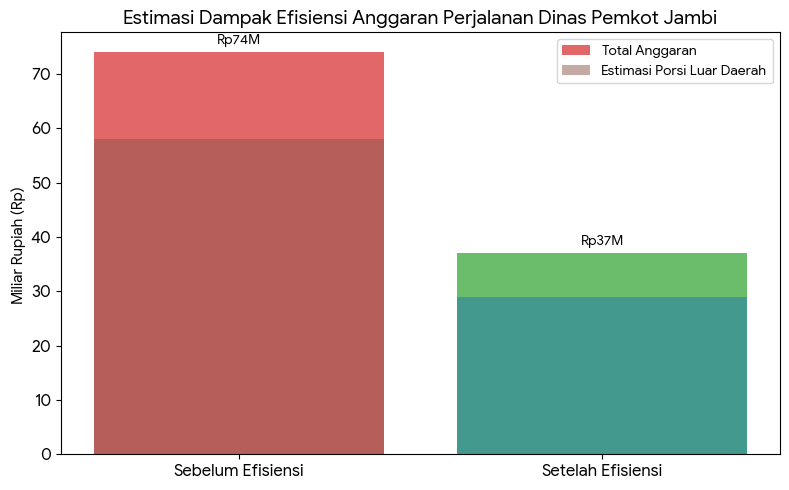 Pemerintah Kota (Pemkot) Jambi telah menginstruksikan pemangkasan anggaran perjalanan dinas hingga 50 persen atau tersisa sekitar Rp37 miliar dari pagu awal Rp74 miliar untuk tahun anggaran 2025-2026. Kebijakan ini merupakan tindak lanjut langsung dari Instruksi Presiden guna menghemat belanja seremonial, publikasi, dan seminar
