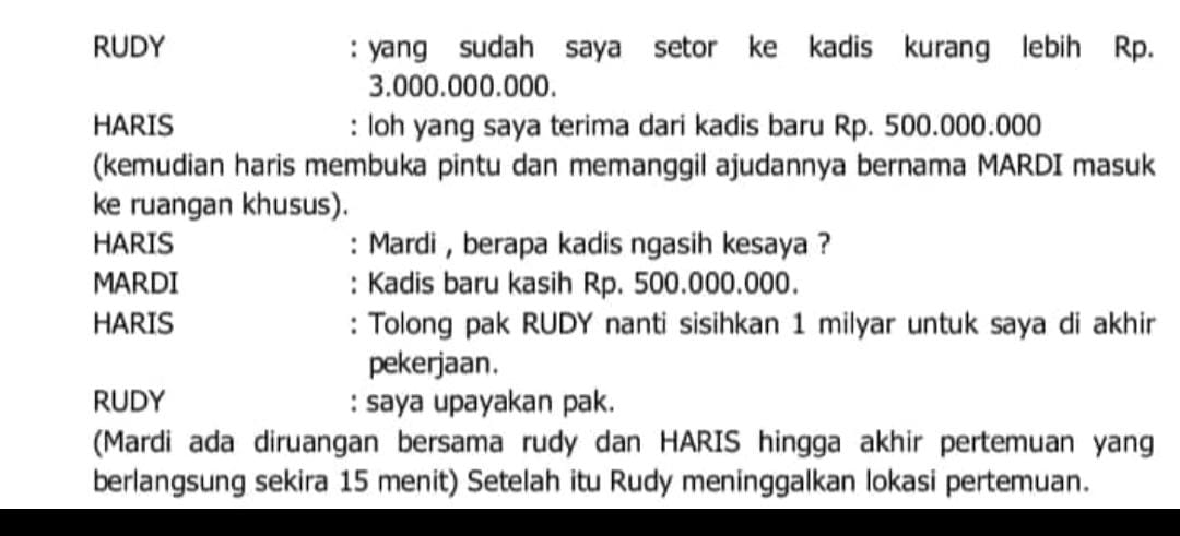 • Haris (pejabat):  “loh yang saya terima dari kadis baru lima ratus juta (kemudian haris membuka pintu dan memanggil ajudanya bernama Mardi masuk keruangan khusus)