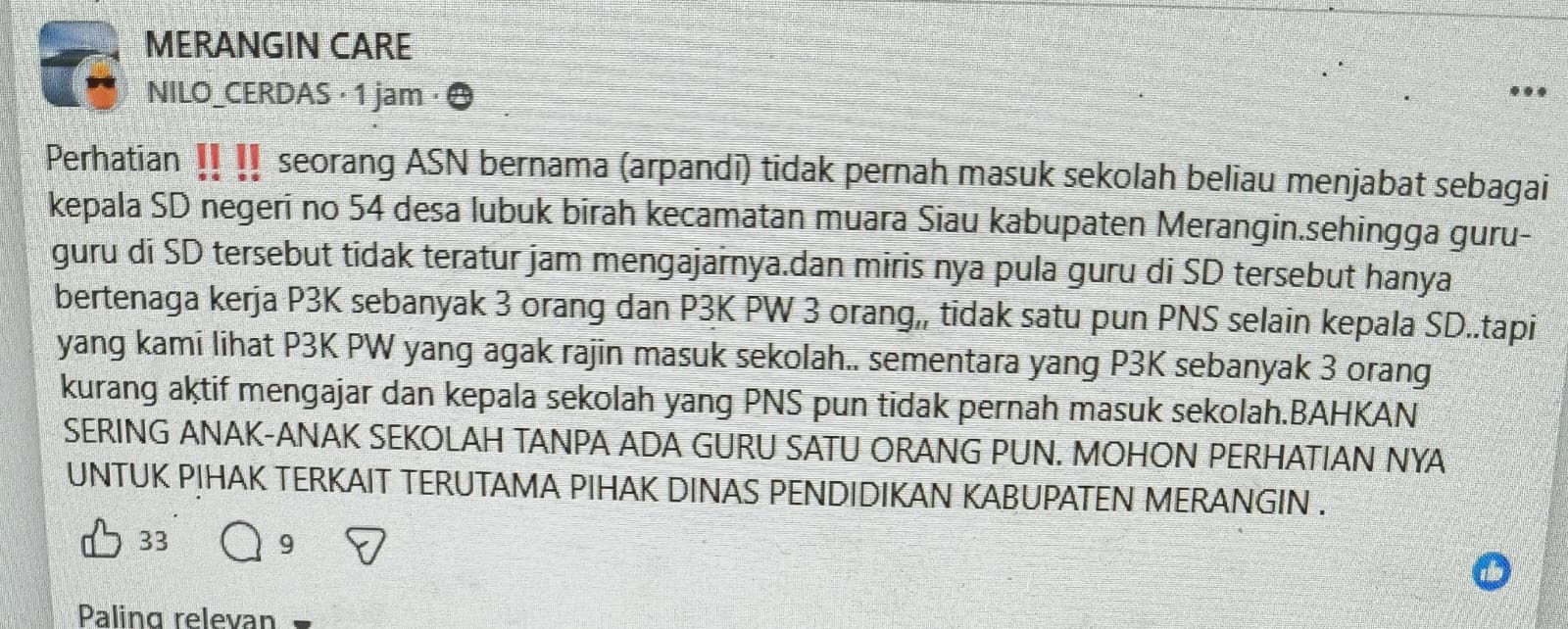 Sebuah unggahan di grup Facebook “Merangin Care” memantik kemarahan publik. Di SD Negeri No. 54 Desa Lubuk Birah, seorang Kepala Sekolah berstatus ASN dilaporkan tak pernah masuk sekolah. Dampaknya, ruang kelas sering kosong melompong, sementara beban mengajar hanya bertumpu pada segelintir guru PPPK.