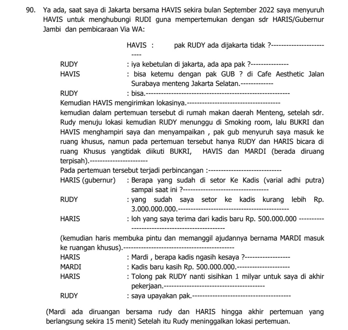 Dalam percakapan BAP terdakwa Rudi bersama Haris (yang diduga sebagai Gubernur Jambi Al Haris) tampak telah terjadi beberapa pertemuan di sejumlah lokasi di Jakarta. Percakapan itu, Haris menanyakan kepada Rudi perihal berapa jumlah uang yang telah disetorkan ke Kepala Dinas Pendidikan Provinsi Jambi kala itu Varial Adhi Putra.
