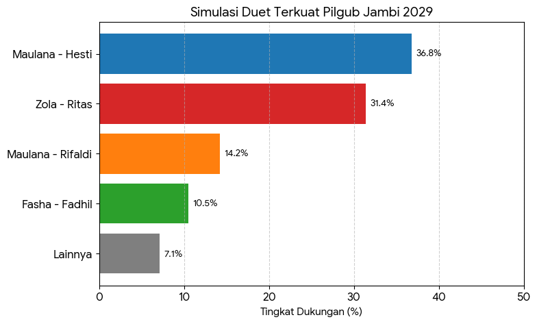Pertarungan Simulasi PasanganBerikut adalah gambaran persentase dukungan dalam simulasi polling pasangan berpasangan (estimasi April 2026):